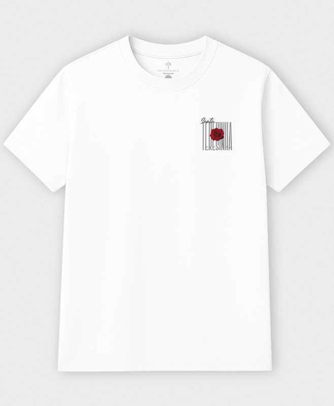 Camiseta Santa Teresinha – Contemplação do Amor A imagem em preto e branco nos conduz ao silêncio interior, como a alma contemplativa de Santa Teresinha. Seu olhar repousava naquele que é o próprio Amor. As rosas vermelhas remetem à santa, mas também à Paixão de Cristo — a mesma que inflamou seu coração e continua a mover os nossos.