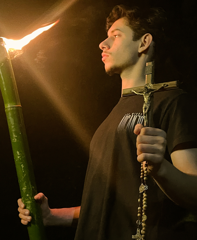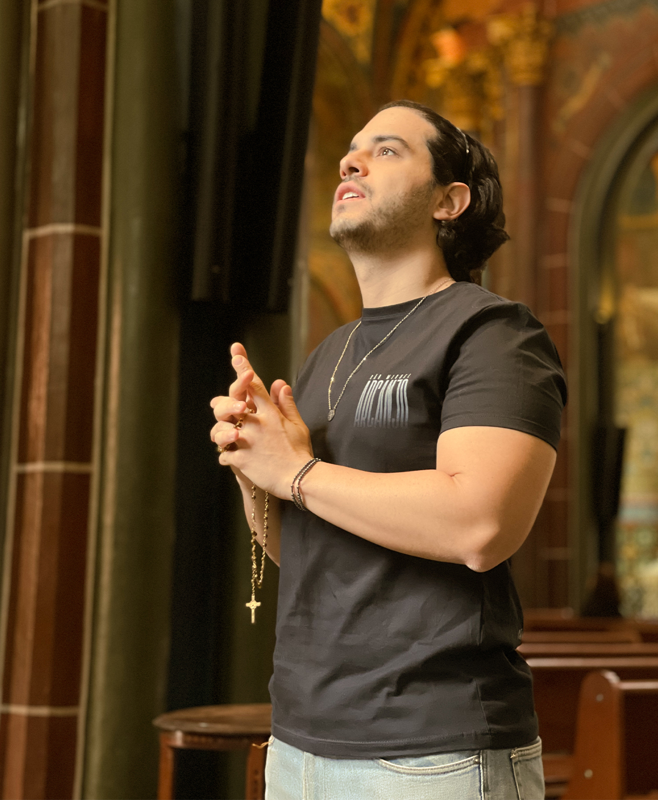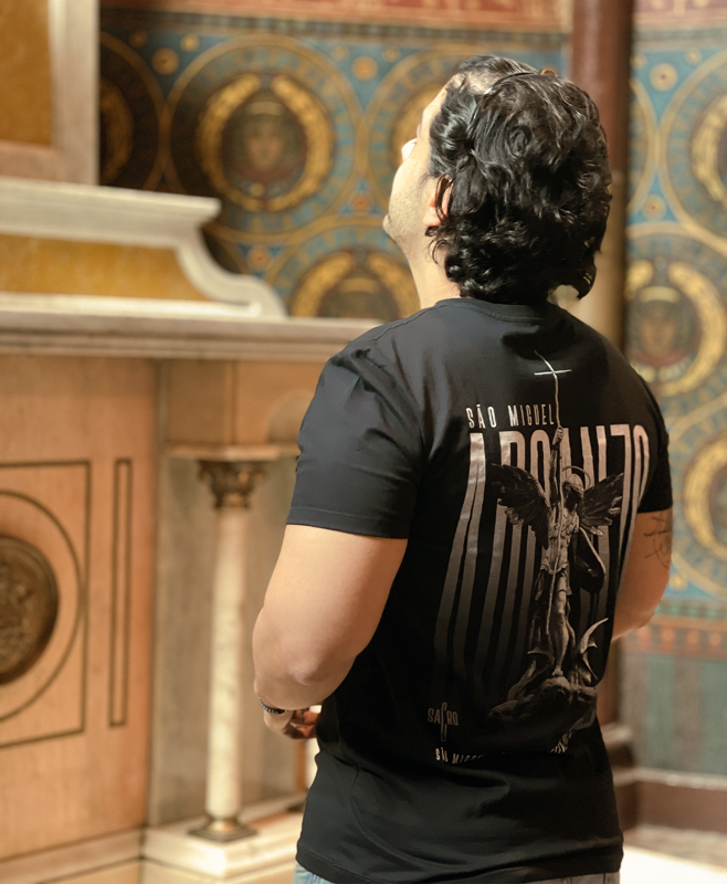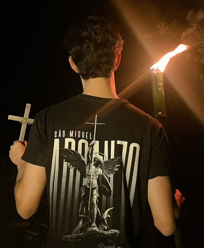 Camiseta São Miguel – Luz que vence a escuridão Do branco ao preto, a estampa reflete o combate eterno: a luz que desce do Alto e dissipa as trevas. É a espada de São Miguel em ação — firme, justa, vitoriosa. Vestir essa peça é lembrar que a escuridão não resiste à luz que vem de Deus.